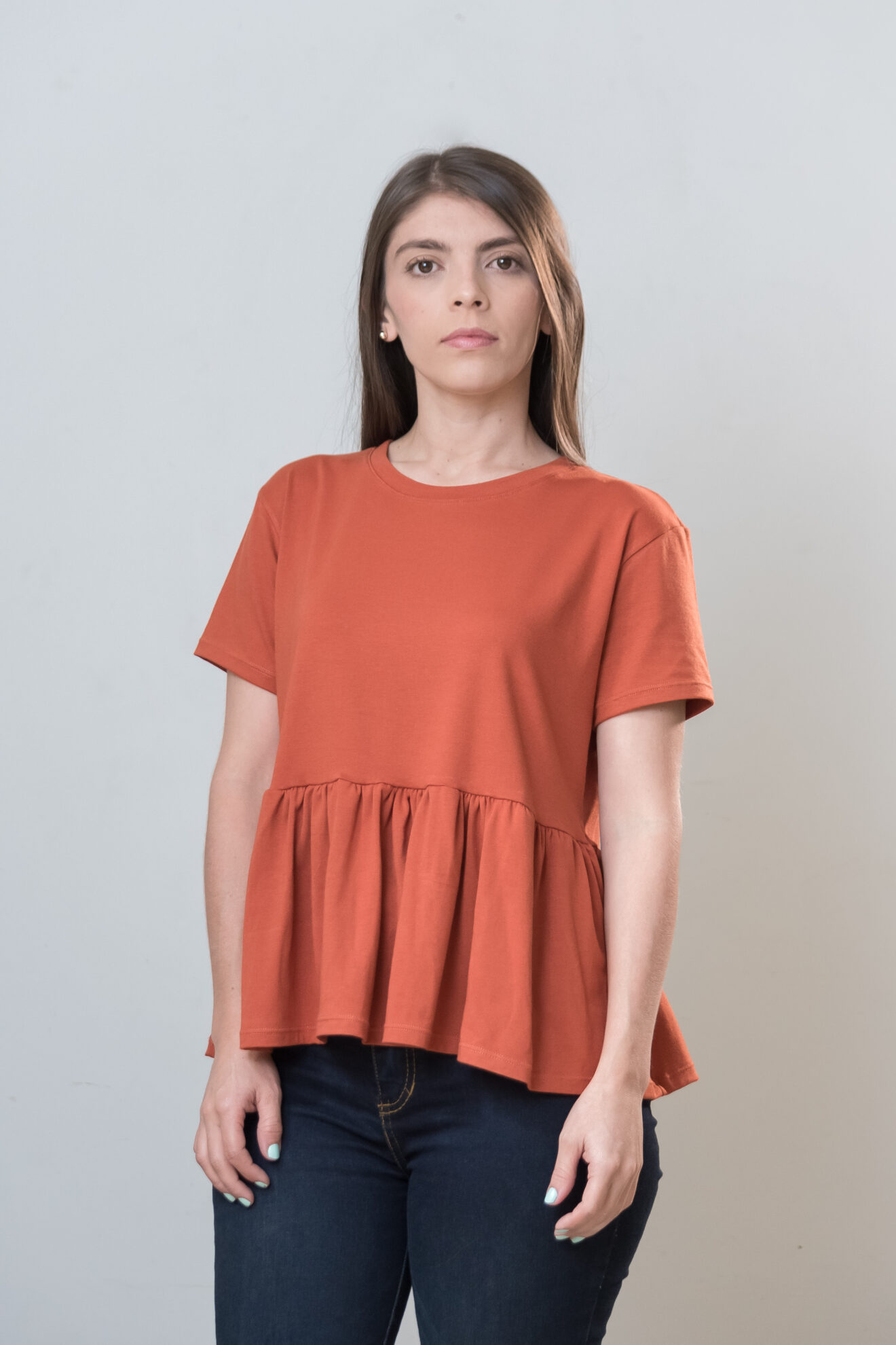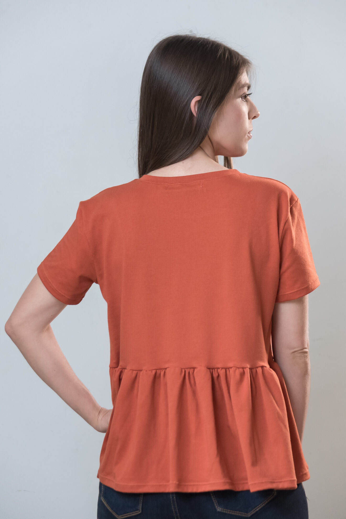 Blusa básica para mujer, cuello redondo, manga corta y silueta holgada.