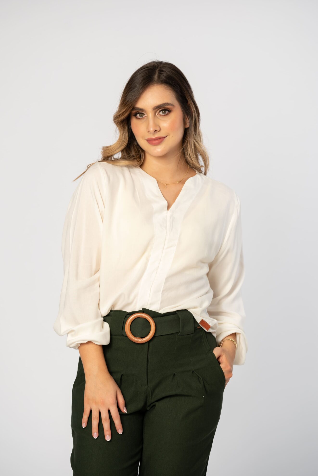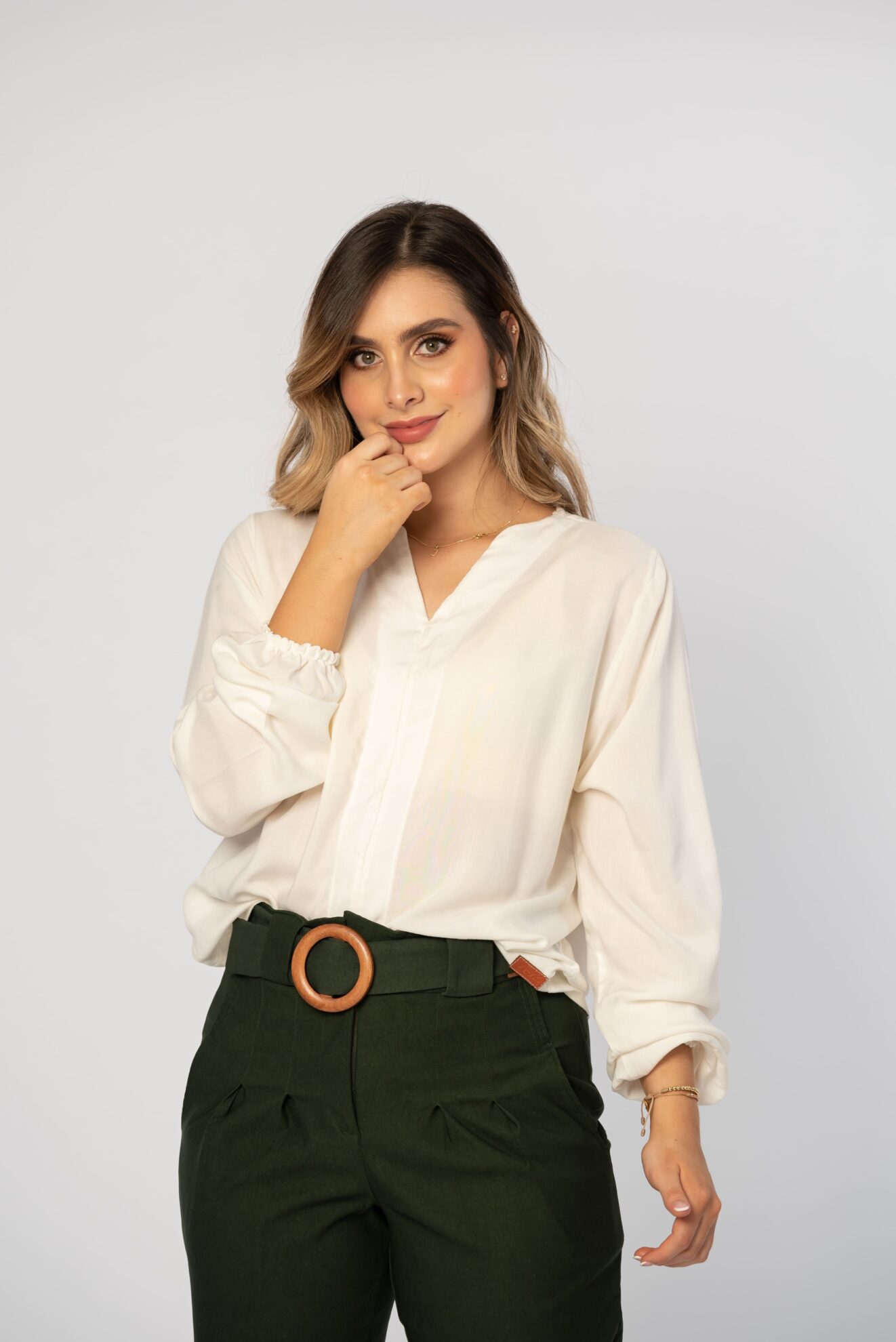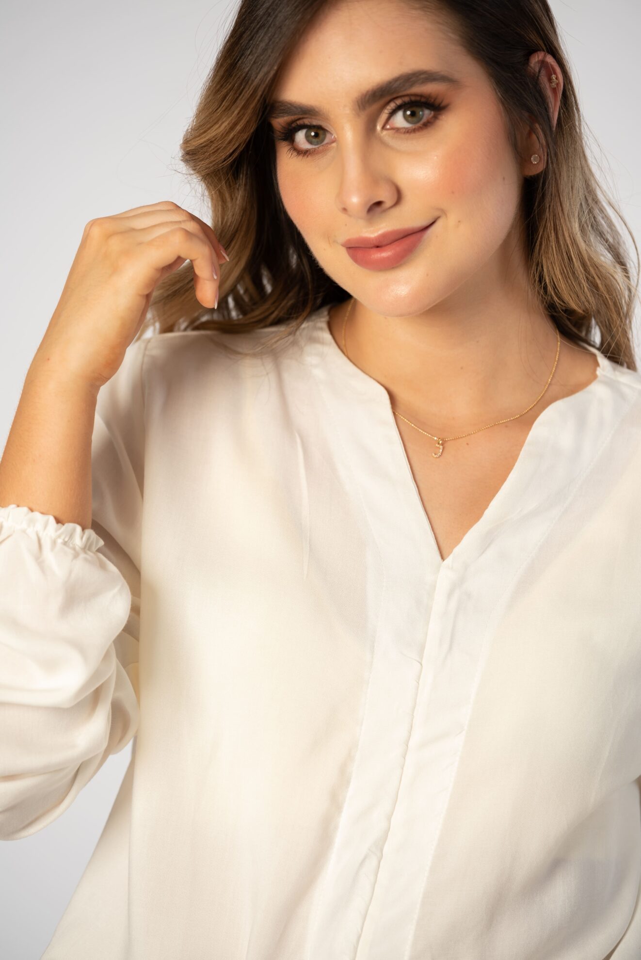 • Camisa para mujer, cuello V, manga Larga y silueta holgada.