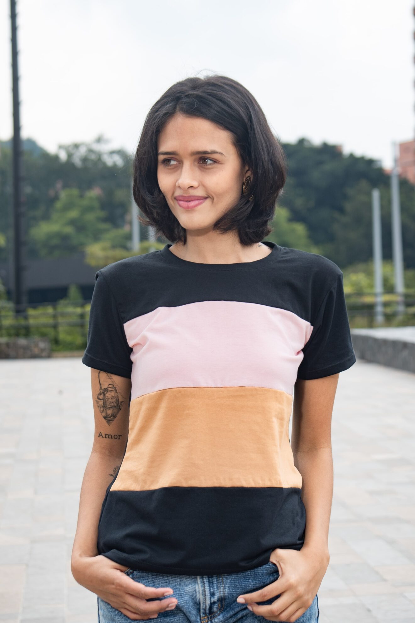 Modelo usa talla S y mide 1.73 m.